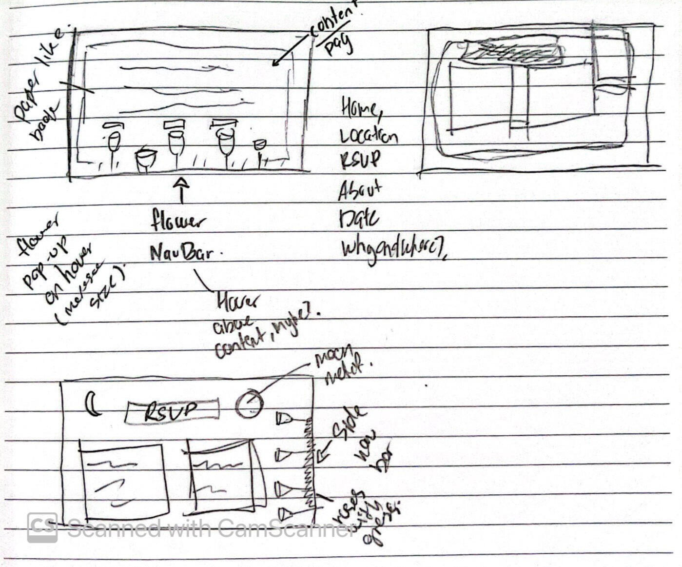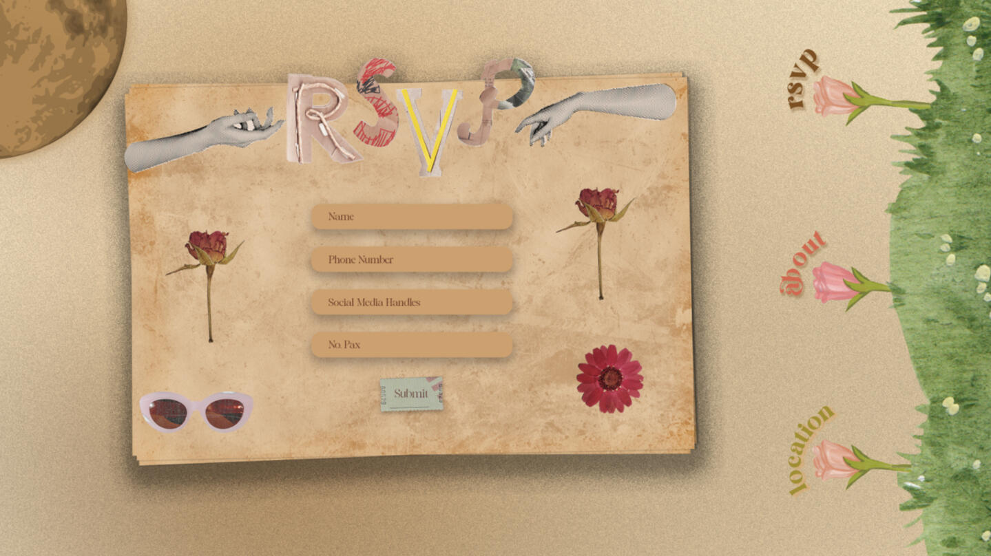 I wanted the NavBar to be a garden of roses of some sort and the pages will slide through by clicking the buttons on the nav bar. As we had limited time on this project I tried to keep it as simple as possible.After designing the first 4 pages that I listed above, I added 1 more additional page which is the Landing Page when you open the microsite, which also acts almost like a loading page. Furthermore, the RSVP Page is a page that has a form, hence, I decided to create a pop-out thank you card when users click submit, making it 6 total pages overall.